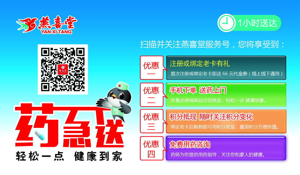 燕喜堂“藥急送”O2O平臺將線下藥店產品展示于線上,體現(xiàn)了燕喜堂順應時代發(fā)展,為顧客提供便捷服務的積極姿態(tài)。,燕喜堂“藥急送”O2O的成立是燕喜堂邁向下一個新的輝煌歷程的堅定保障,也是將燕喜堂“健康藥房,用愛服務”的服務理念再次延伸,通過“藥急送”O2O平臺,開啟“互聯(lián)網(wǎng)+”醫(yī)療健康時代,顧客可以享受到一小時內送貨上門的服務,給顧客帶來完美的便捷式購物體驗。在此過程中,燕喜堂也將成長壯大為醫(yī)藥連鎖行業(yè)的標桿品牌。在今后的日子里,燕喜堂將繼續(xù)用心服務所有顧客,創(chuàng)造更好的購藥體驗環(huán)境,成為百姓信得過的家庭健康顧問。
